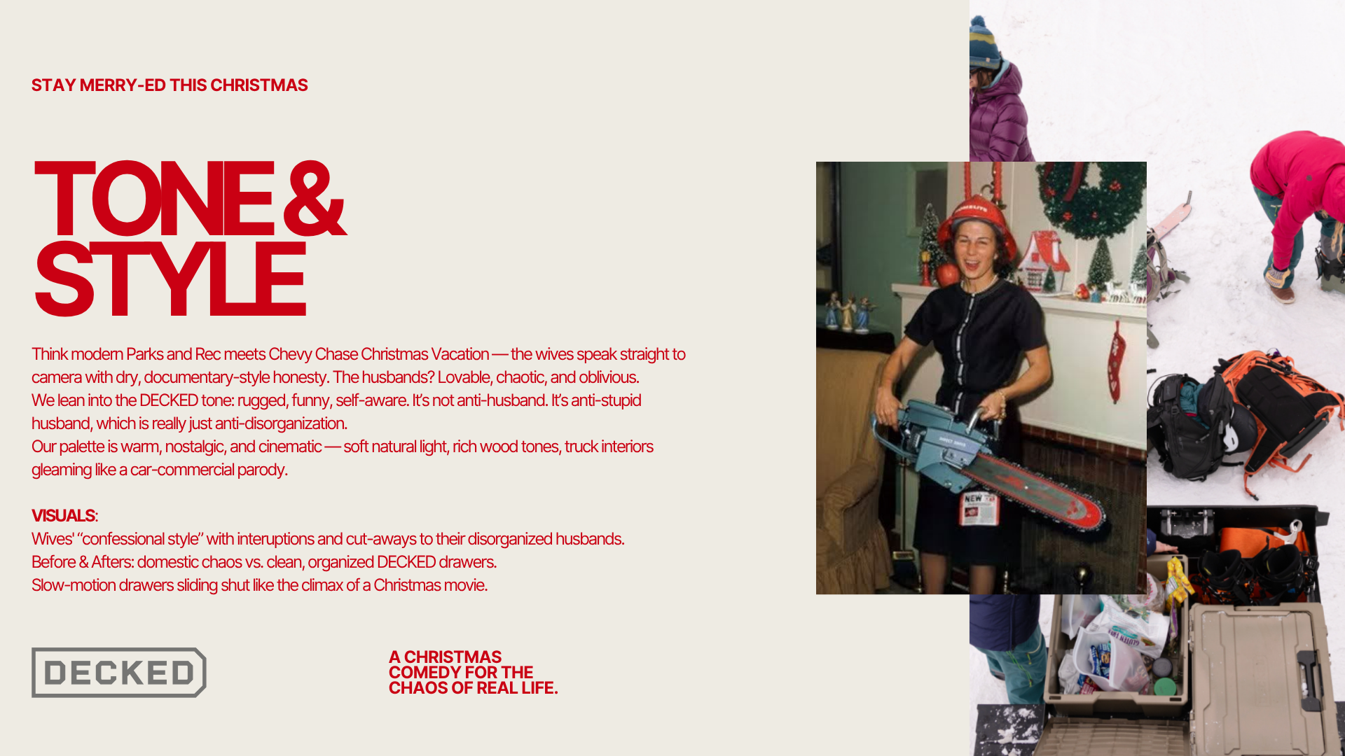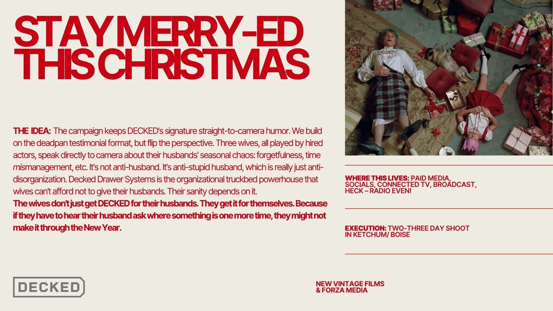A Christmas comedy campaign for the chaos of real life — written, conceived, and pitched in six days for Decked Drawer Systems.